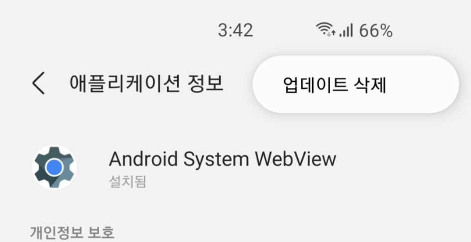 * 설정 > 애플리케이션 > Android System Webview 선택 > 더보기(⋮) > 업데이트 삭제