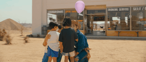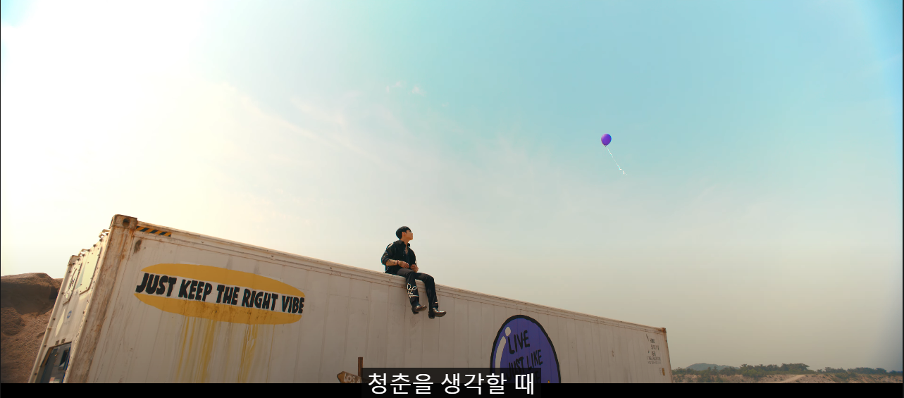 그곳엔 정국이 트레일러 위에 앉아있고, 보라색 풍선이 날아가는 중